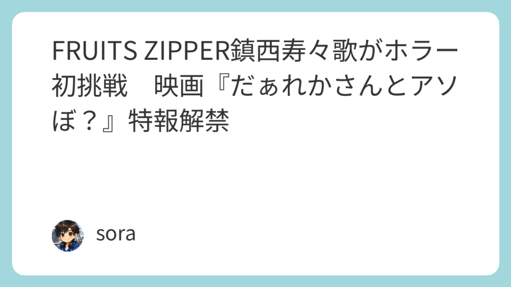FRUITS ZIPPERの鎮西寿々歌が、清水崇監督の最新映画「だぁれかさんとアソぼ?」で映画単独初主演を務めることが発表されました。作品は“絶対にやってはいけない遊び”を軸にした学園ホラーで、2026年7月24日に全国公開されます。特報映像とティザービジュアルも解禁され、注目を集めています。