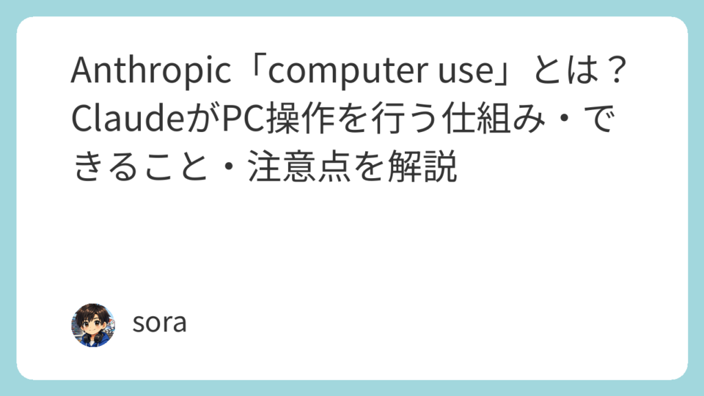 Anthropicは2024年10月22日、Claudeの新機能として「computer use」を公開ベータで発表しました。これは、Claudeが画面上の情報を確認しながら、カーソル移動、クリック、テキスト入力などを行い、デスクトップ環境上のタスクを進められる機能です。