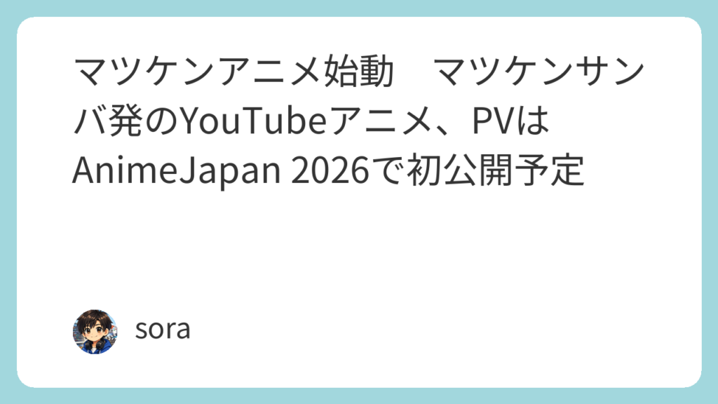 「マツケンアニメ」は、「マツケンサンバ」をモチーフにした新規YouTubeアニメプロジェクトとして始動しました。2026年夏の配信開始が予定されており、2026年3月28日・29日の「AnimeJapan 2026」では、タツノコプロブースでプロモーション動画が初公開される予定です。